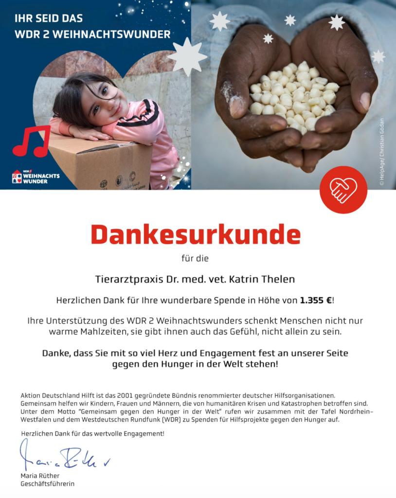 Auch in 2025 war es uns ein Anliegen, das WDR-2-Weihnachtswunder zu unterstützen und wir haben tolle Sponsoren gefunden, die unser Projekt unterstützen. Sie können ganz einfach Lose über info@tierarztpraxis-rheinbach.de bestellen und über diese E-Mail-Adresse auch via Paypal bezahlen. Lassen Sie uns gemeinsam ein wenig gegen den Hunger in der Welt tun!