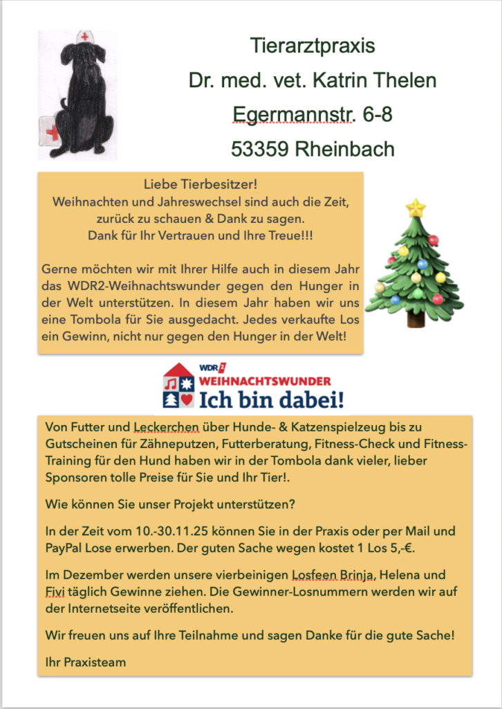 Auch in diesem Jahr ist es uns ein Anliegen, das WDR-2-Weihnachtswunder zu unterstützen und wir haben tolle Sponsoren gefunden, die unser Projekt unterstützen. Sie können ganz einfach Lose über info@tierarztpraxis-rheinbach.de bestellen und über diese E-Mail-Adresse auch via Paypal bezahlen. Lassen Sie uns gemeinsam ein wenig gegen den Hunger in der Welt tun!